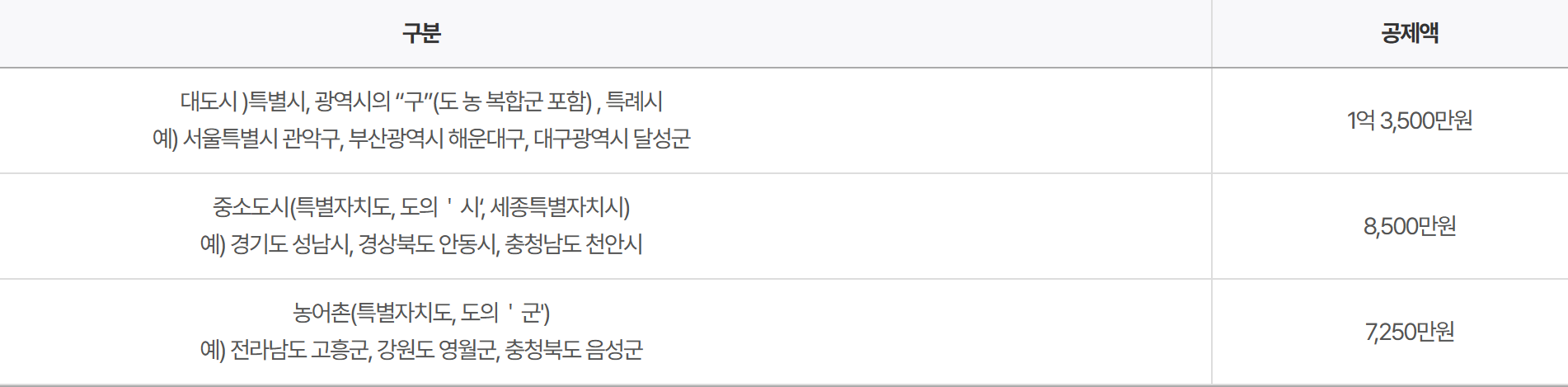 이뿐만 아니라 대도시 기준도 변경되었습니다. 대도시는 1억 3천5백만 원, 중소도시는 8천500만 원, 농어촌은 7천2백50 마원입니다.