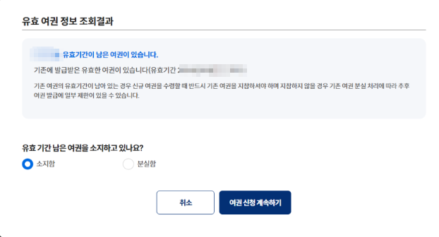 그러면 유효기간 만료 확인하기 위해 '유효 여권 정보 조회' 화면이 나타납니다. 조회 버튼을 클릭하여 기존 여권의 유효기간을 확인하고, 신청하기를 클릭하시면 됩니다. 조회 결과가 나오면 남은 유효기간 여부를 확인하게 되는데, 이후의 절차를 진행하기 위해 '신청하기'를 선택합니다.