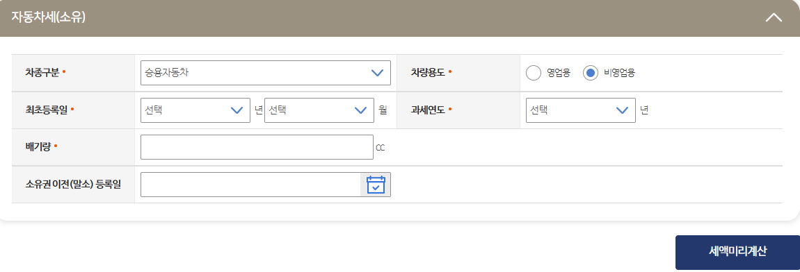 3. 자동차세(소유)에서 차종구분, 차량용도, 최초등록일, 과세연도, 배기량, 소유권 이전 말소 등록일을 작성해 주시고, 세액 미리 계산 클릭하시면 예산 내역이 나옵니다.
